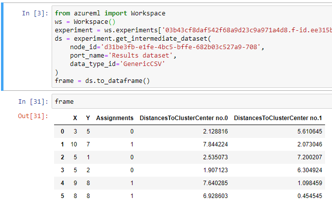 Buradaki ilk kod bloğu Azure ML Studio üzerindeki dataset kutumuzu Python ortamına bağlıyor ve frame adındaki bir değişkene atıyor. Ama henüz bu kod çalıştırılmadı. Kod bloklarını çalıştırmak için, ilgili blok seçili iken Shift + Enter kombinasyonuna basmamız gerekiyor. Bunu ilk kod bloğu için yapın.